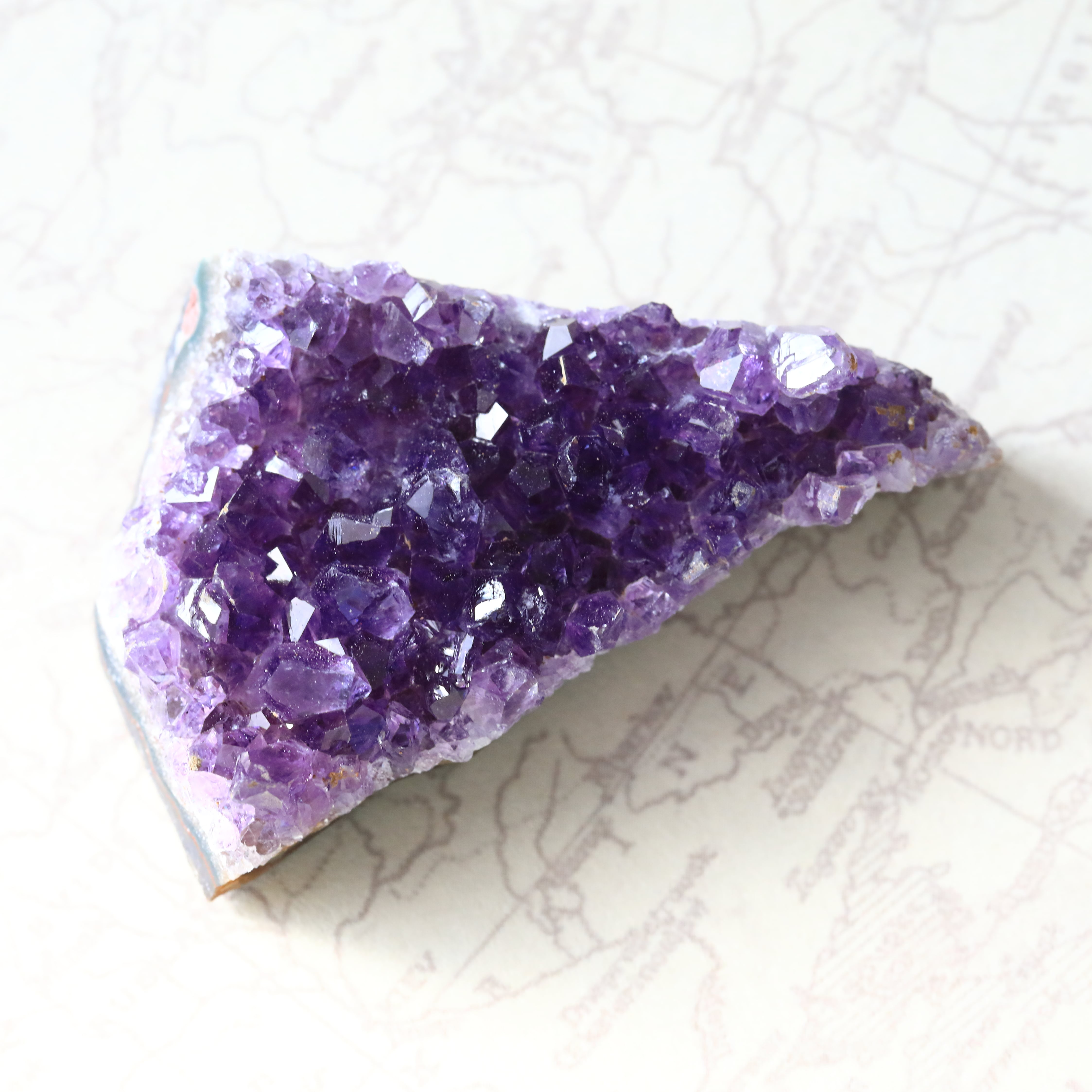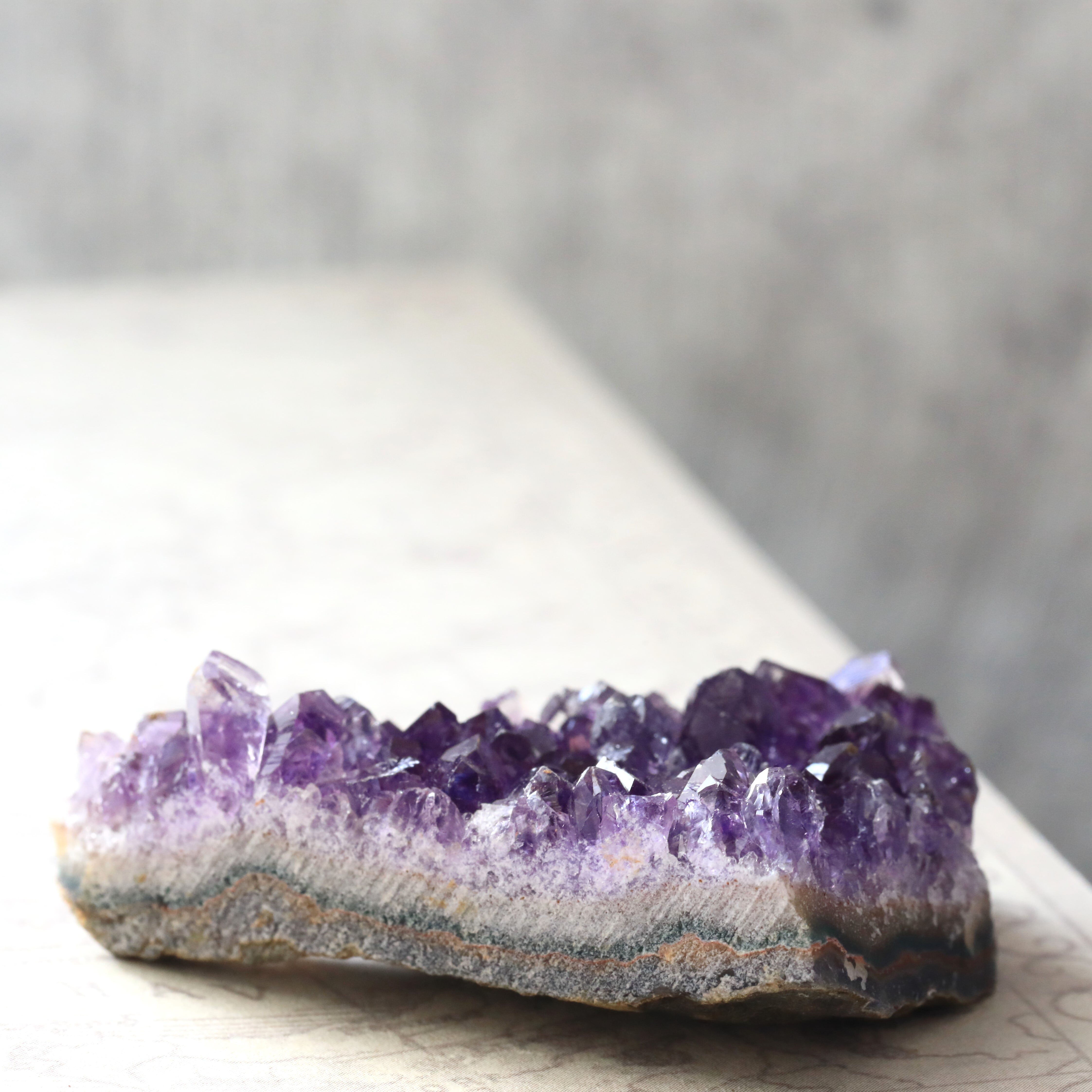 叡智と癒しの石、アメジスト。紫色は「高貴」「霊性」「癒やし」の象徴とされ、特に精神的な落ち着きと内観を促すエネルギーを持つとされています。
