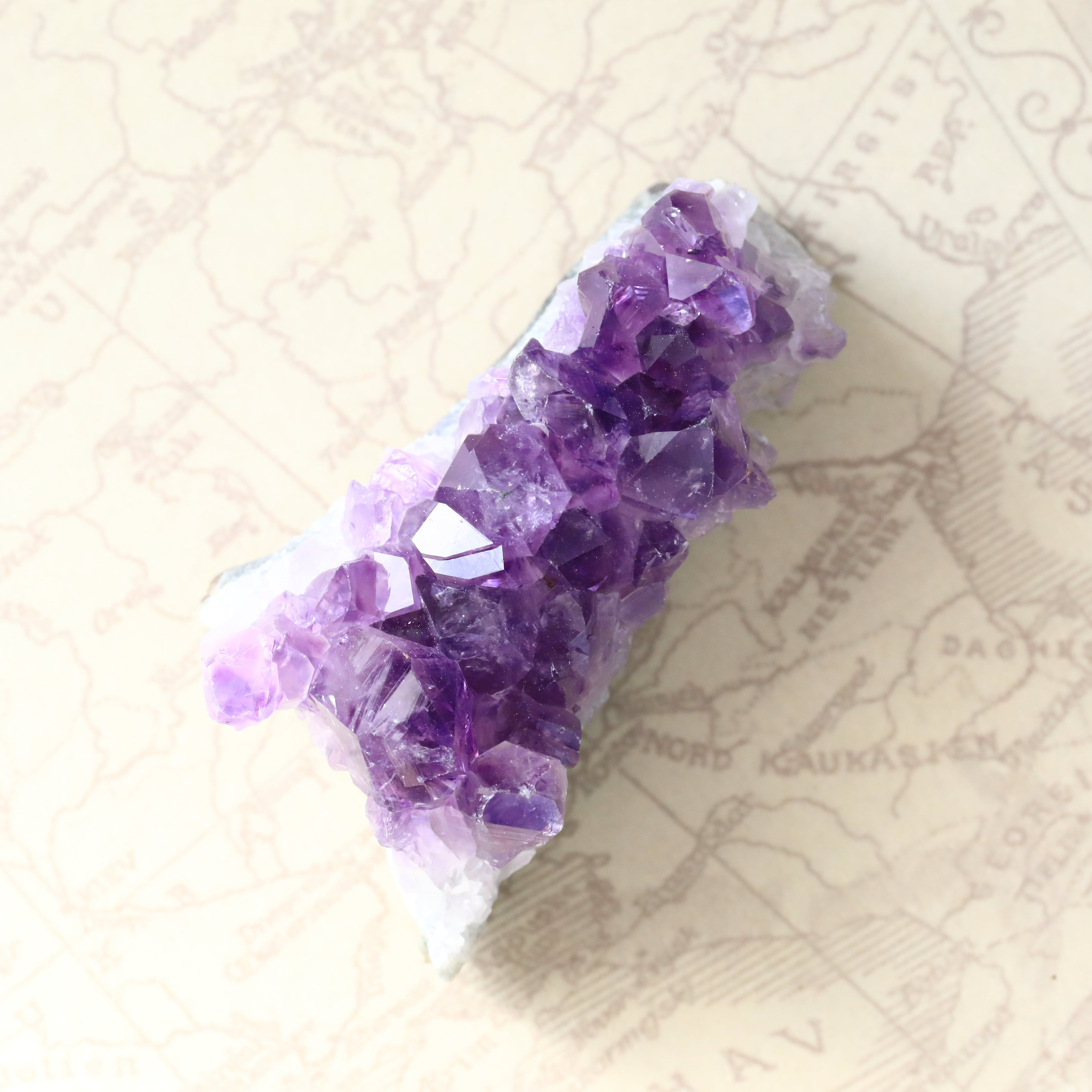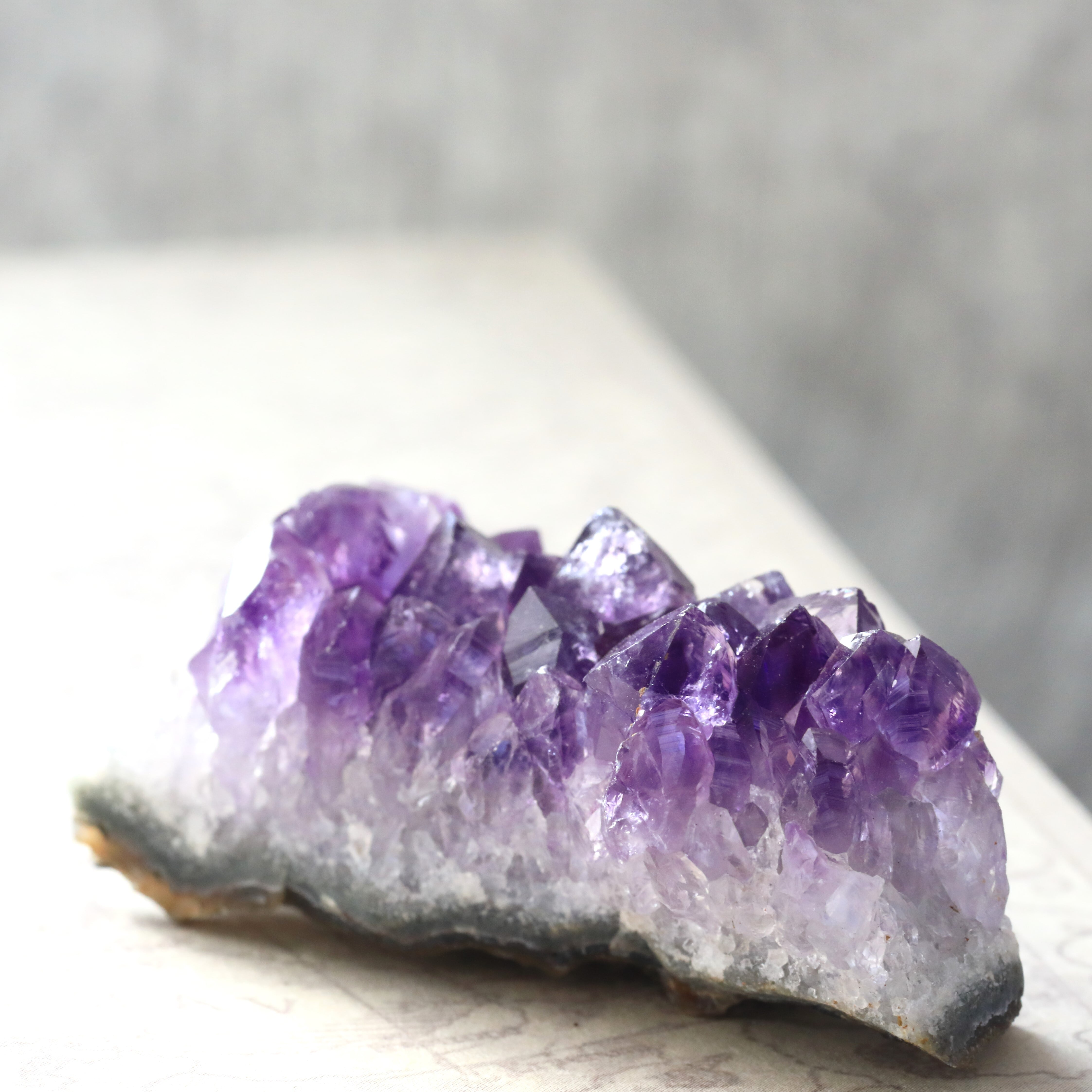 叡智と癒しの石、アメジスト。紫色は「高貴」「霊性」「癒やし」の象徴とされ、特に精神的な落ち着きと内観を促すエネルギーを持つとされています。