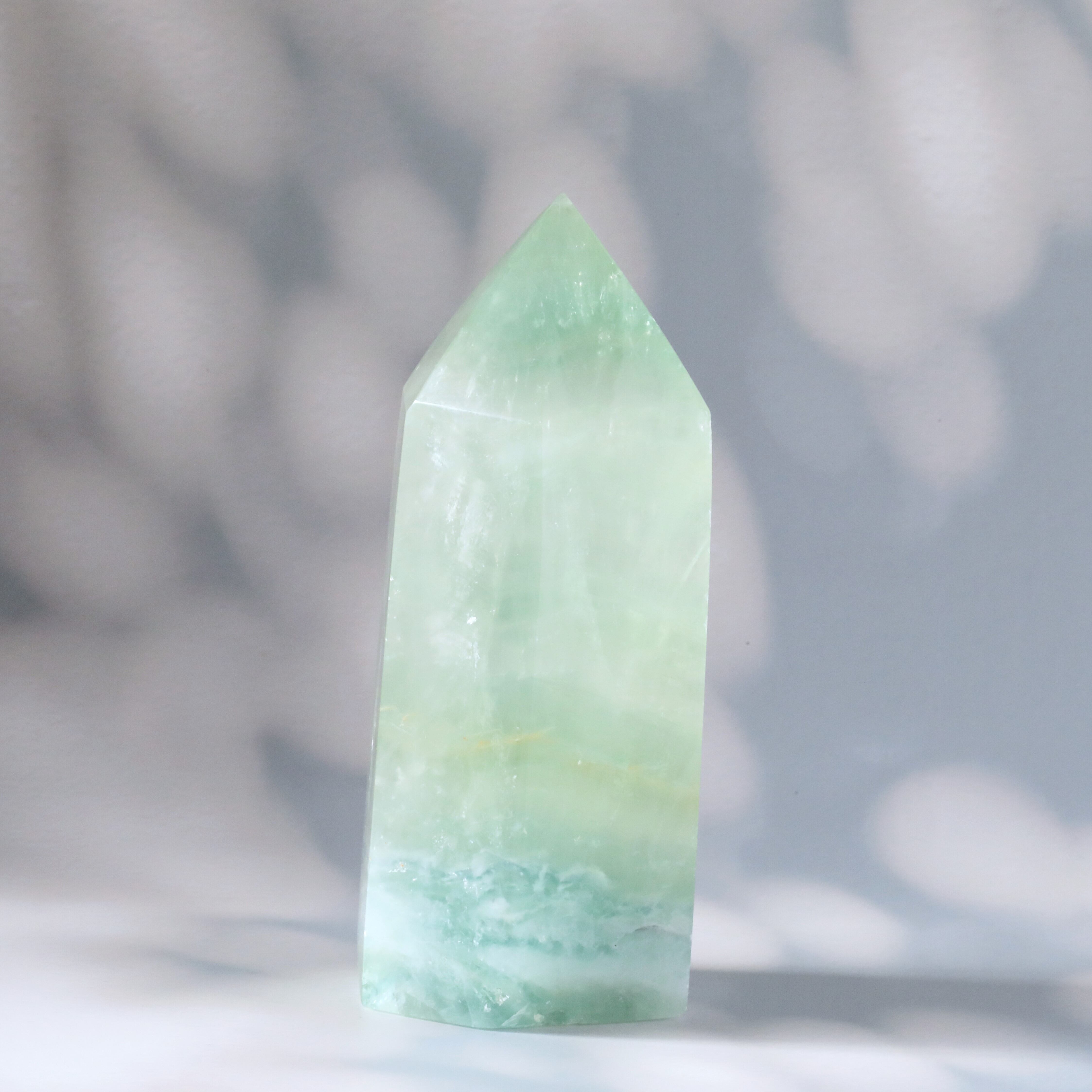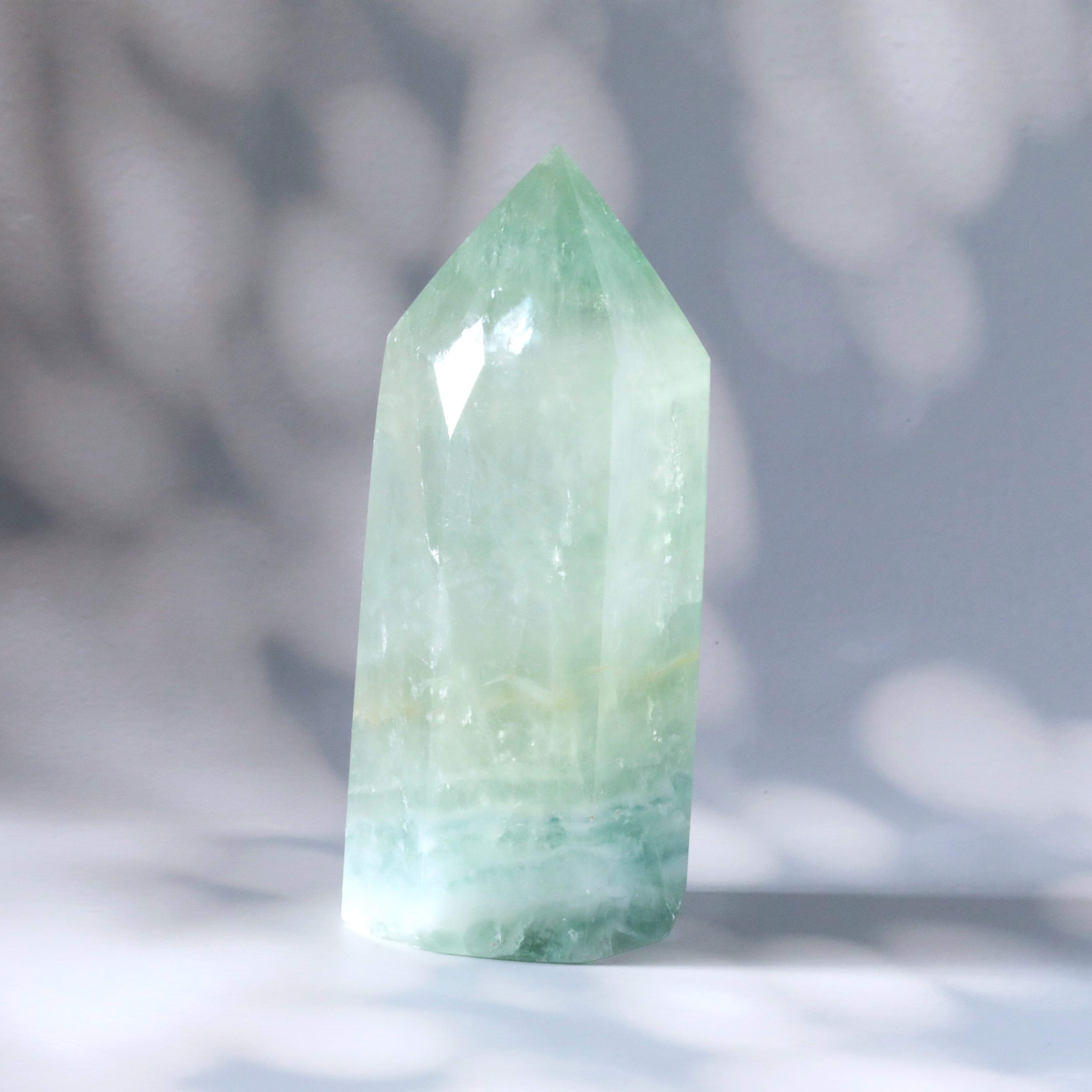 透け感がこれからの初夏にぴったりの、淡いミントグリーンが爽やかなグリーンフローライト。ポイント下部から覗く結晶成長の証である、シーグリーンや黄味がかるカラーゾーニングを土台に、先端に向かうにつれ 透明感が増してゆくタイプ。