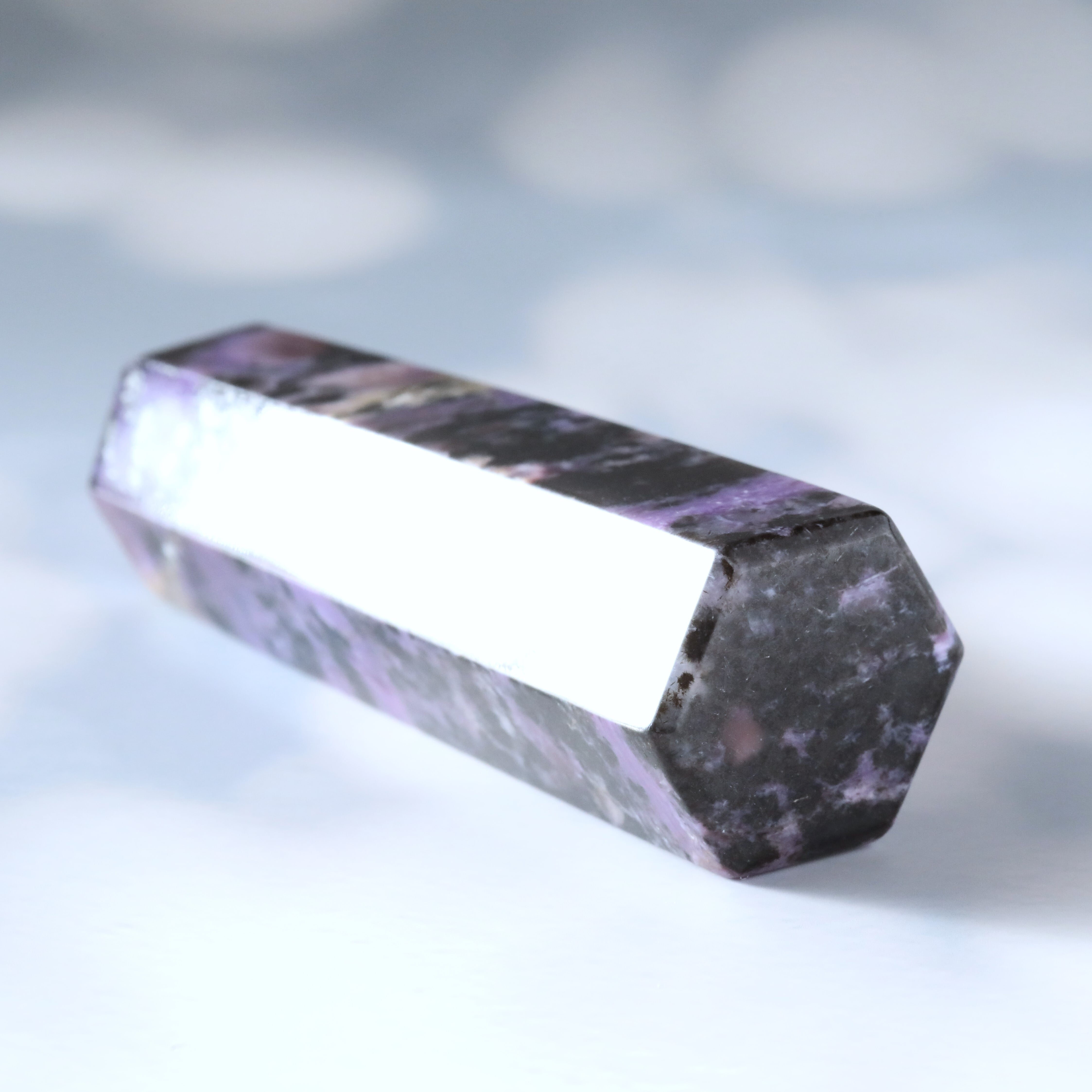 天使たちが描く、叡智と癒しの油彩画 チャロアイト。スギライト、ラリマーと並び、世界三大ヒーリングストーンと称される希少なクリスタルです。角もすっかり丸く処理されたポリッシュタイプですので、瞑想の際に握っても大丈夫。とても滑らかな手触りと、優しいシルキーな輝きが覗きます。