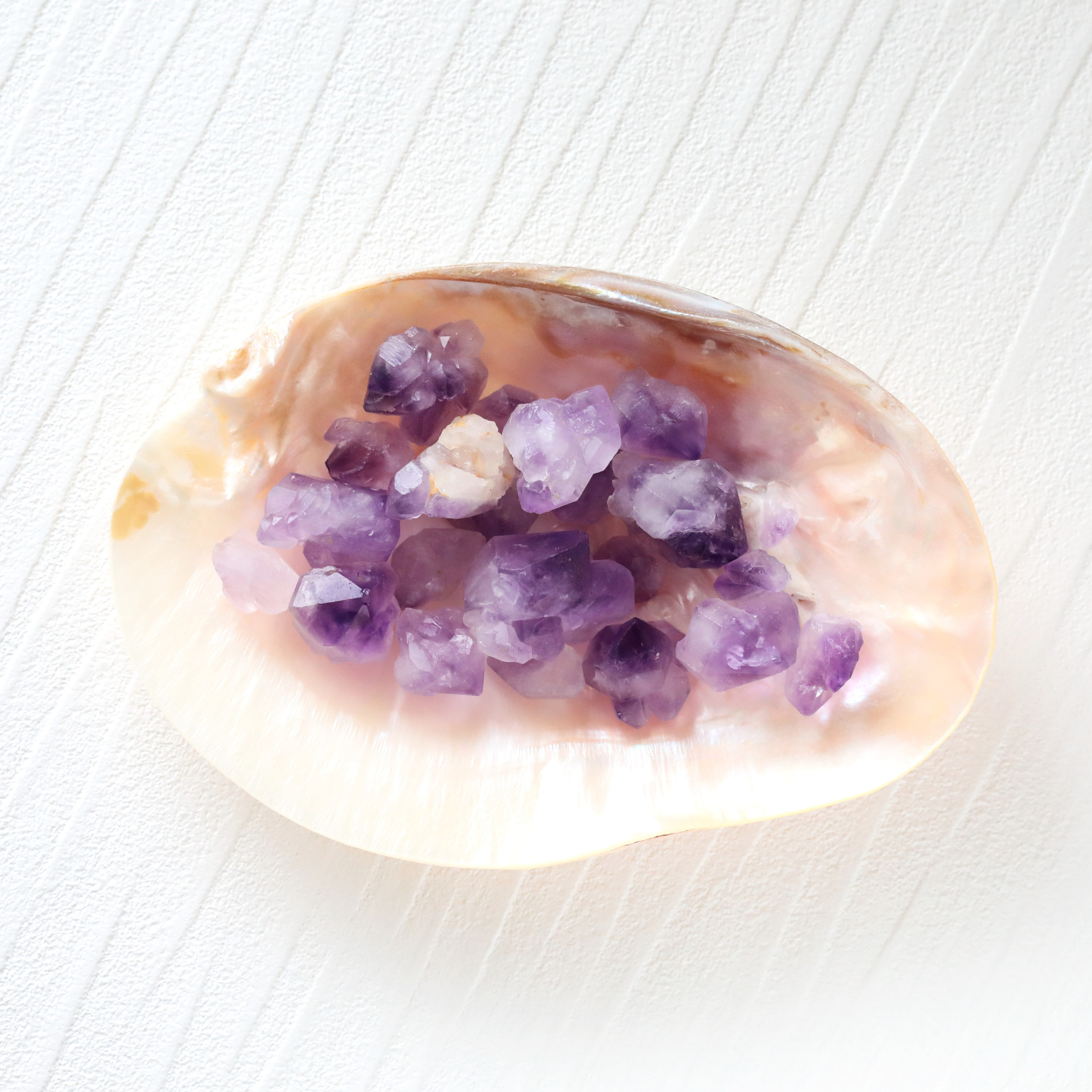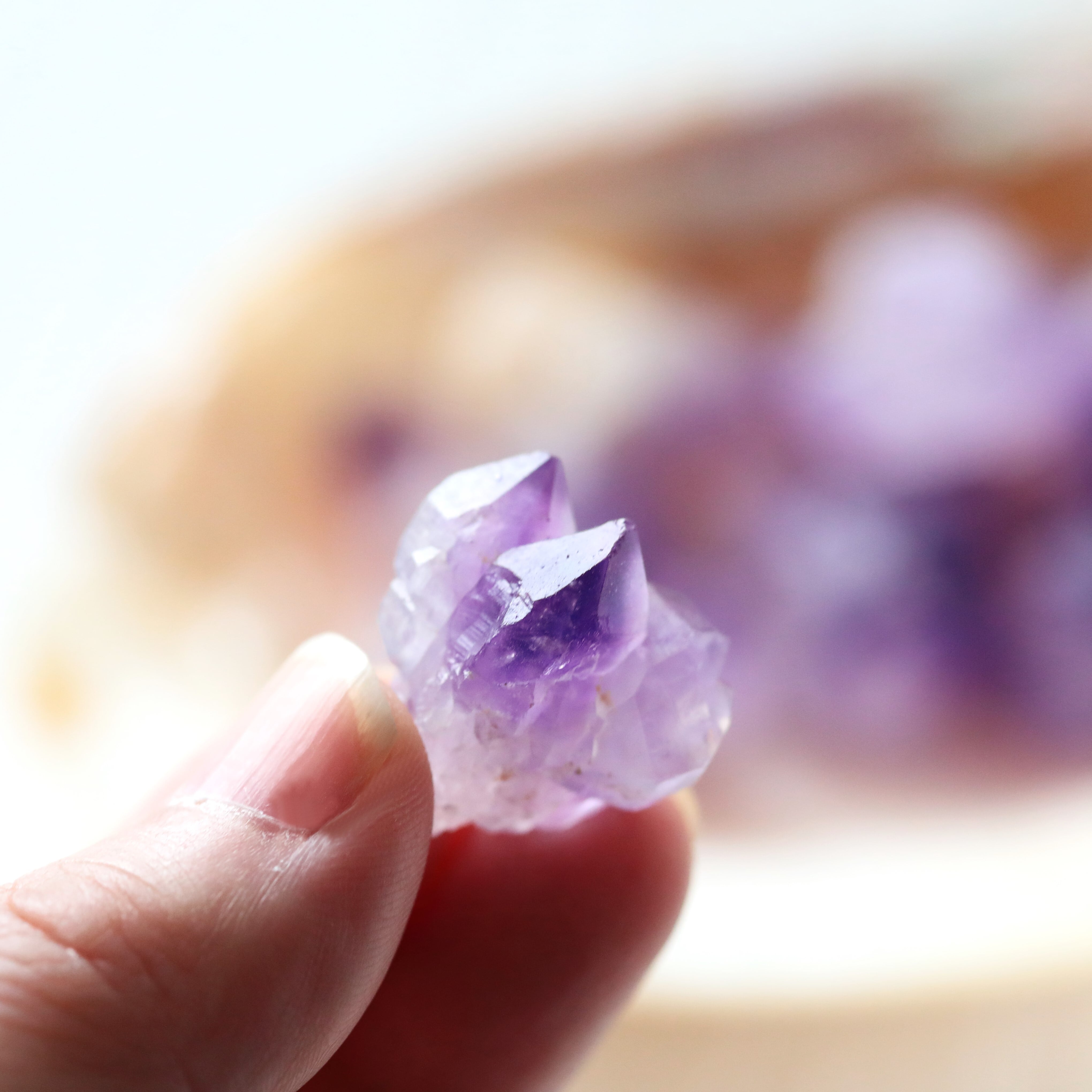 叡智と癒しの石、アメジスト。紫色は「高貴」「霊性」「癒やし」の象徴とされ、特に精神的な落ち着きと内観を促すエネルギーを持つとされています。