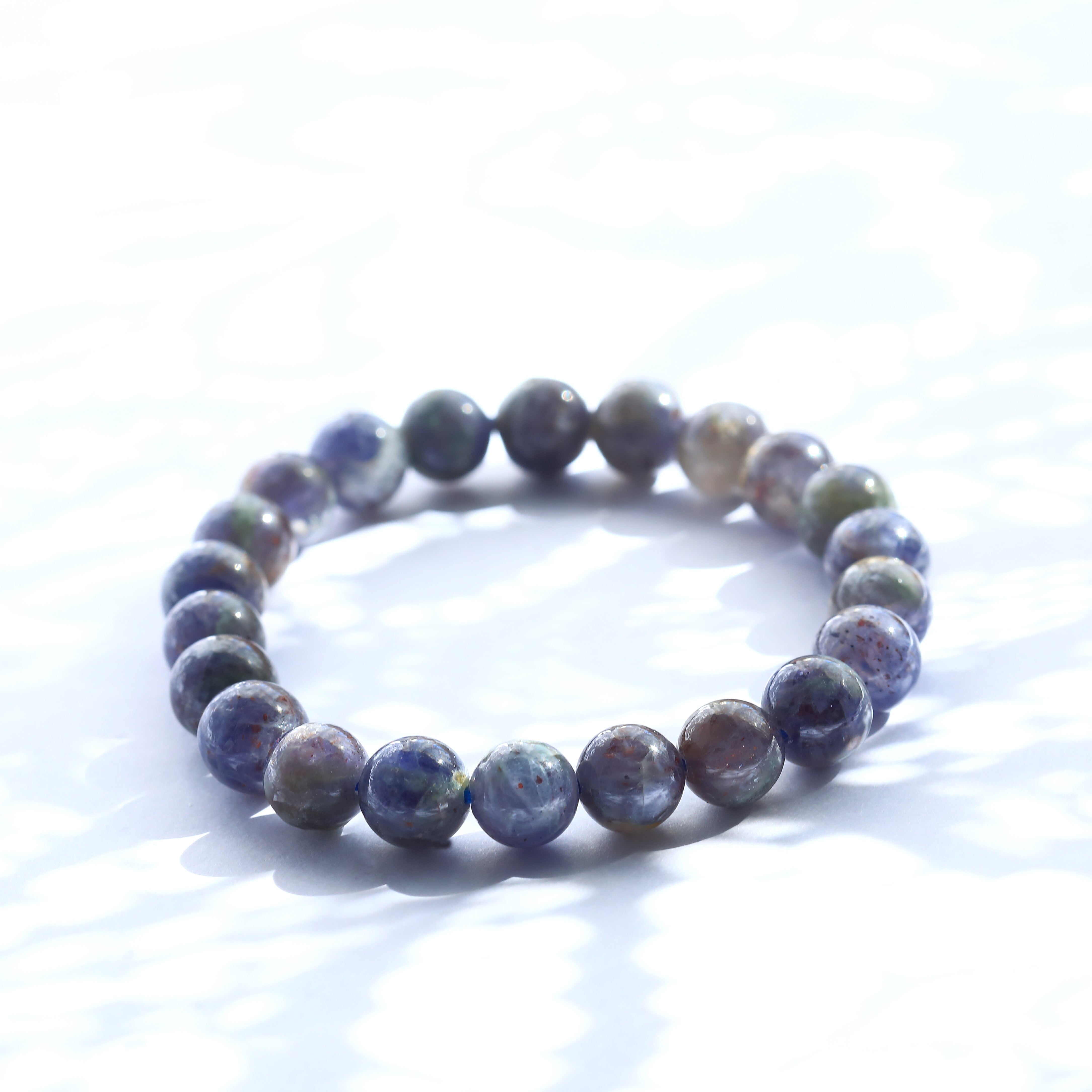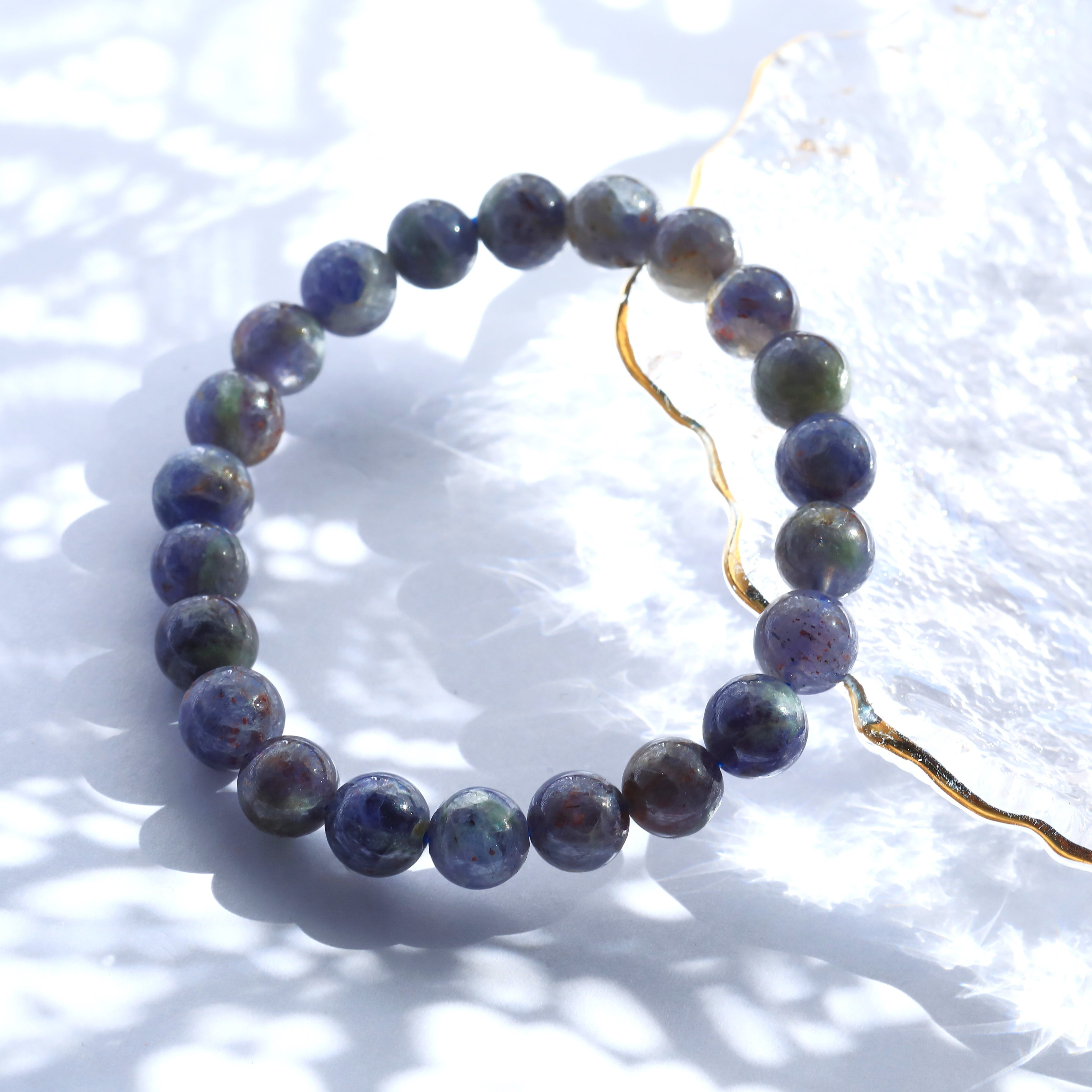 アイオライトとシリカが混ざり合い、さらにレピドクロサイトなどのインクルージョンによって、青紫をベースに赤や金などの輝きを同時に愛でれます。